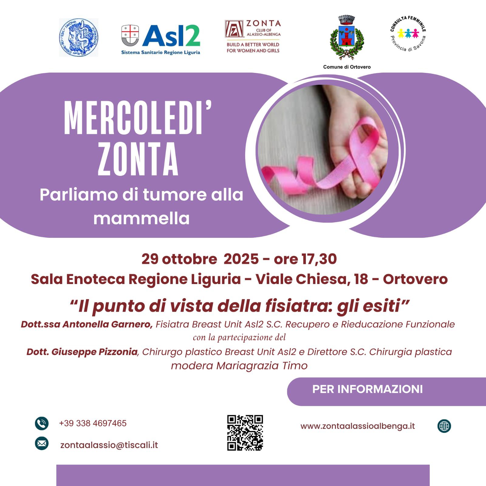 Appuntamento in Sala Enoteca alle 17,30 di mercoledì 29 per "il punto di vista della fisiatra: gli esiti", incontro conclusivo della Rassegna organizzata dallo Zonta Club Alassio Albenga nel mese deputato alla prevenzione del tumore alla mammella.